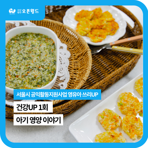 오픈월드는 ‘서울시 공익활동지원사업’ 일환으로 영유아 영양, 건강, 발달을 지원하는 ‘영유아쓰리UP'을 진행하고 있습니다. 이중 영유아 양육자 대상으로 아기 영양 및 식재료 이론과 이유식 및 유아반찬 쿠킹클래스를 진행하는 ’건강UP'이야기를 전해드립니다.